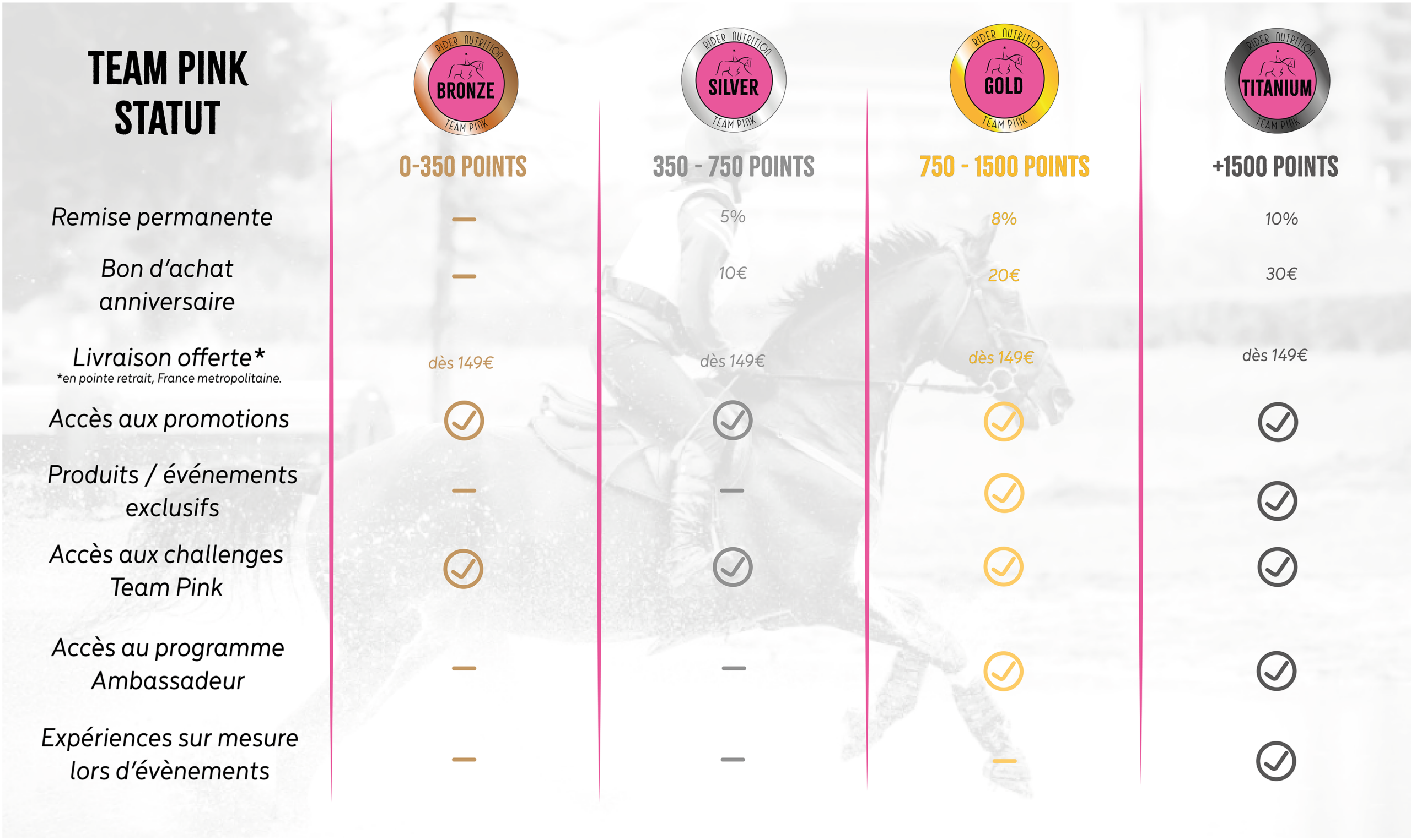 Aidez-nous à agrandir notre équipe ! En rejoignant la ‘Team Pink’, Vous trouverez un lien de parrainage (code)* dans la section « Rewards Programme » de votre compte.. Partagez-le avec vos amis : Ils recevront un bon d’achat de 10 € à dépenser sur notre boutique en ligne Rider Nutrition*.