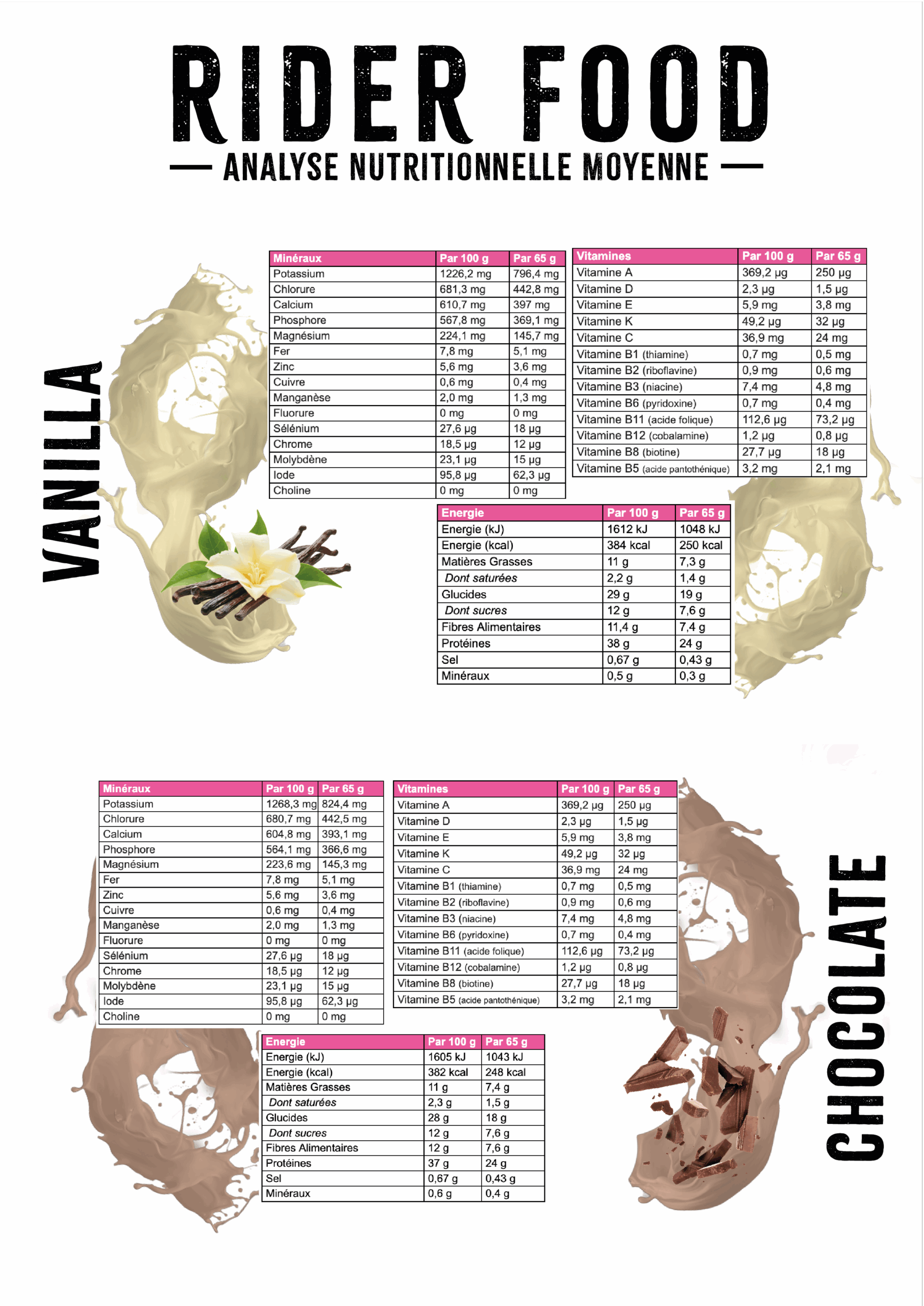 Comme il est souvent difficile de se nourrir en concours ou pendant l’entraînement, la Boisson-repas Rider Food contient tous les nutriments essentiels dont le corps a besoin au quotidien. De plus, ce produit comporte une faible quantité de sucre et de calories.