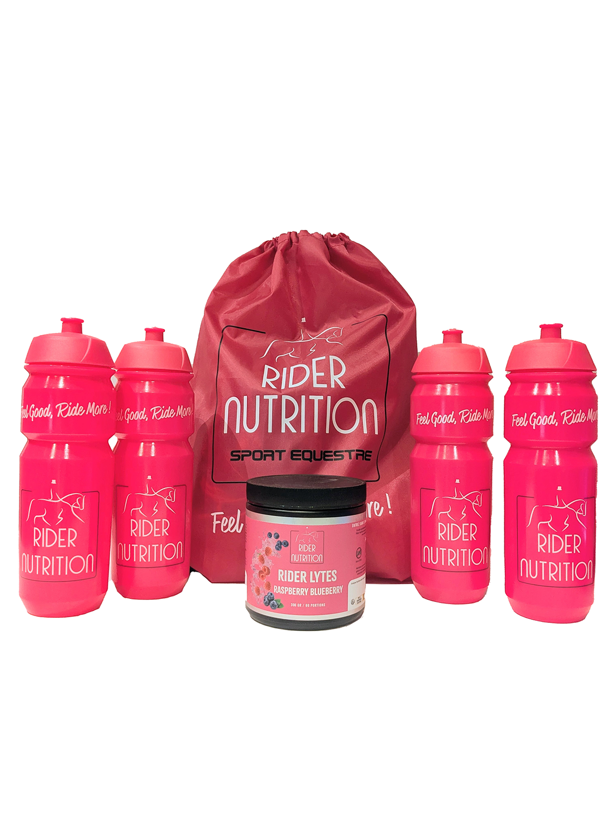 Le Pack Team Hydratation donne l’occasion à 4 cavaliers de partager une boîte d’électrolytes en concours ou à l’entraînement avec 4 gourdes Rider Nutrition fournies et un sac à dos Rider Nutrition pour transporter le tout.